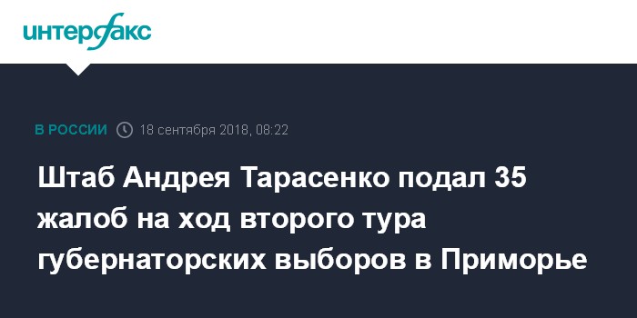 Москва. 18 сентября. INTERFAX.RU - Штаб кандидата в губернаторы Приморья от "Единой России" Андрея Тарасенко подал 35 жалоб в краевую избирательную комиссию на ход второго тура выборов, готовится еще 10 жалоб.