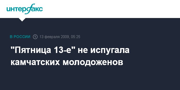 Петропавловск-Камчатский. 13 февраля. ИНТЕРФАКС-ДАЛЬНИЙ ВОСТОК - "Пятница 13-е" не испугала камчатских молодоженов. Во Дворце Бракосочетаний Петропавловска-Камчатского в этот день будет зарегистрировано 10 браков, сообщила агентству "Интерфакс-Дальний Восток" руководитель агентства записи актов гражданского состояния Камчатского края Татьяна Бутакова.
