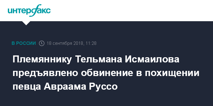 Москва. 18 сентября. INTERFAX.RU - Следственный комитет России предъявил племяннику бывшего владельца Черкизовского рынка Тельмана Исмаилова обвинение в похищении певца Авраама Руссо, совершенном в 2004 году, сообщила адвокат Исмаилова Марина Русакова.