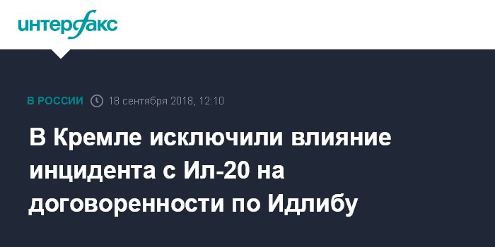 Москва. 18 сентября. INTERFAX.RU - В Кремле отвергли возможность того, что инцидент со сбитым российским самолетом над Средиземным морем повлияет на реализацию российско-турецких договоренностей по Идлибу, достигнутых в лидерами двух стран в понедельник в Сочи и закрепленных в меморандуме.