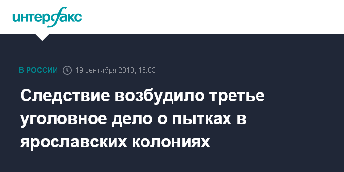 Москва. 19 сентября. INTERFAX.RU - Следственный комитет возбудил новое уголовное дело о пытках в ярославской колонии №8, сообщили "Интерфаксу" в заявлении фонда "Общественный вердикт".