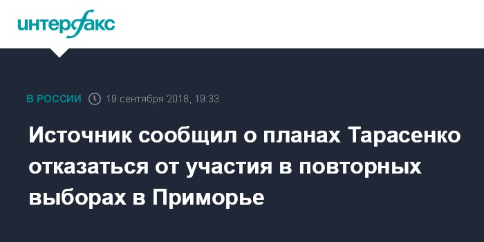 Москва. 19 сентября. INTERFAX.RU - Кандидат от "Единой России" Андрей Тарасенко, боровшийся за пост губернатора Приморского края, скорее всего, не примет участия в повторном голосовании, сообщил "Интерфаксу" источник, знакомый с планами Тарасенко.