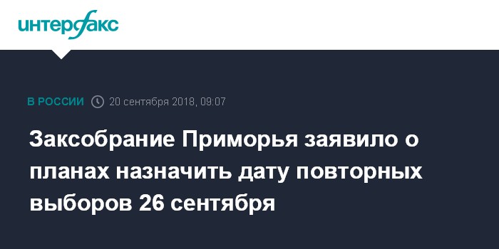 Москва. 20 сентября. INTERFAX.RU - Законодательное собрание Приморского края, как ожидается, может рассмотреть вопрос о назначении даты новых выборов губернатора региона 26 сентября, сообщили агентству "Интерфакс" в пресс-службе краевого парламента в четверг.