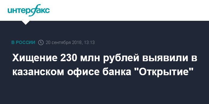 Хищение 230 млн рублей выявили в казанском офисе банка "Открытие"