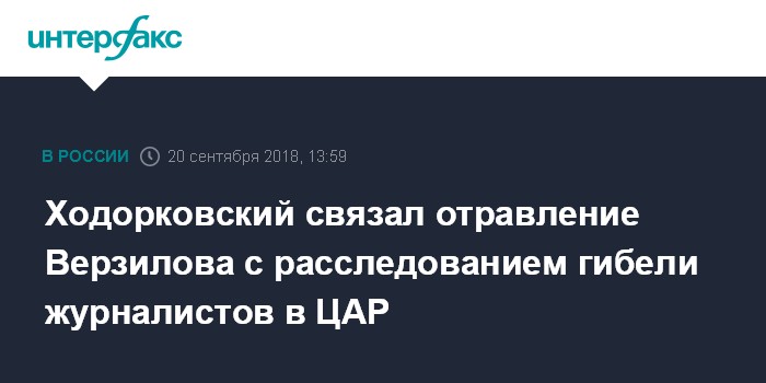 "Исходя из имеющихся у меня фактов, я полагаю отравление (Верзилова) реальным, а события взаимосвязанными", - написал Ходорковский в статье на сайте "МБХ Медиа", отметив при этом, что организованное им расследование гибели журналистов в ЦАР ведется из Лондона, к нему не привлекается никто из Москвы, в том числе, Верзилов.