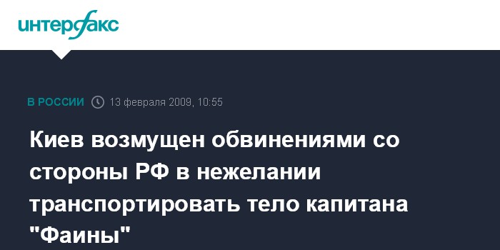 Москва. 13 февраля. INTERFAX.RU - В Киеве возмущены обвинениями российской стороны в нежелании транспортировать тело капитана судна "Фаина" Владимира Колобкова. "Уже в который раз российская сторона пытается исказить информацию о конкретном случае, речь идет о возвращении членов экипажа и возможности транспортировки тела капитана судна Колобкова", - сообщил агентству "Интерфакс-Украина" источник в дипломатических кругах.