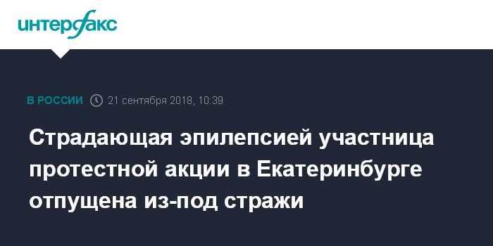 Москва. 21 сентября. INTERFAX.RU - Кировский районный суд Екатеринбурга освободил участницу акции протеста против повышения пенсионного возраста Ирину Норман, которая страдает эпилепсией, сообщили агентству "Интерфакс-Урал" в суде.