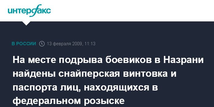 Москва. 13 февраля. INTERFAX.RU - В ходе разбора завалов дома в Назрани, который подорвали боевики при попытке их задержания в минувший четверг, обнаружена снайперская винтовка и три паспорта лиц, находящихся в федеральном розыске.