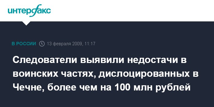 Москва. 13 февраля. INTERFAX.RU - Следствием по делу о хищениях бюджетных средств в одной из воинских частей, дислоцированных на территории Чечни, выявлен дополнительный факт крупной недостачи. Ранее там была выявлена недостача в 64 млн рублей.