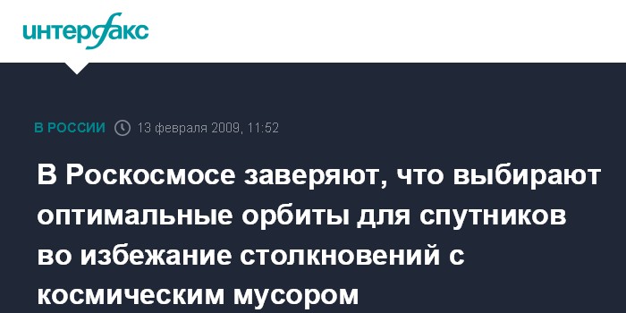 "Орбиты всех спутников выбираются оптимально, чтобы на их пути было поменьше осколков (космических аппаратов, находящихся в космосе - ИФ). Если столкновения с таким осколками избежать нельзя, производится маневрирование", - сообщил А.Шилов, отвечая на вопрос, угрожают ли обломки столкнувшихся на орбите космических аппаратов "Иридиум-33" и "Космос-2251" другим аппаратам, находящимся на орбите.