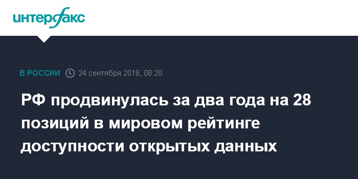 Москва. 24 сентября. INTERFAX.RU - Россия продвинулась за год на 12 позиций, до 13-го места в мировом рейтинге Open Data Barometer, который оценивает, как правительства раскрывают данные в открытом формате и какой это дает социальный и экономический эффект.