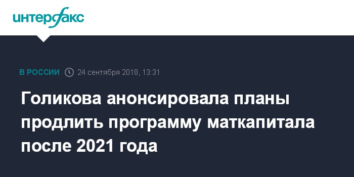 "Дальше будем также осуществлять мониторинг ситуации, как по увеличению рождаемости, так и по снижению смертности, поскольку стоит задача по увеличению естественного прироста населения в Российской Федерации. На основе этого мониторинга, я сказала, что с высокой долей вероятности мы примем решение о продлении. С высокой долей вероятности", - сказала вице-премьер РФ Татьяна Голикова журналистам.