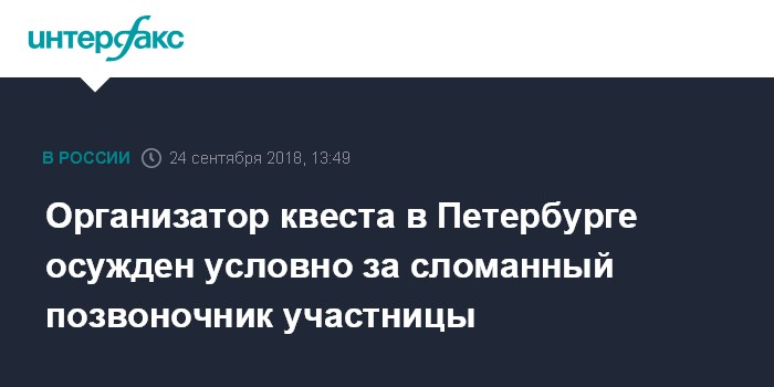 Москва. 24 сентября. INTERFAX.RU - Организатор экшн-квеста в Петербурге получил условный срок за перелом позвоночника одной из участниц игры, сообщает пресс-служба прокуратуры города в понедельник.