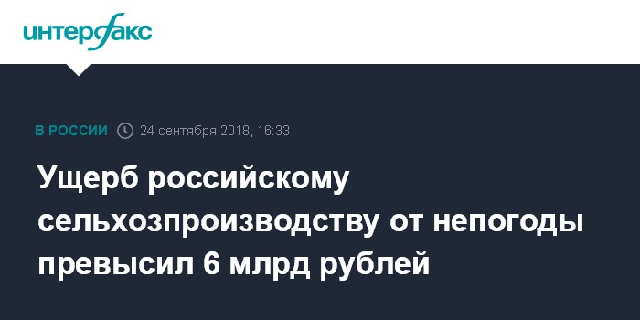 Москва. 24 сентября. INTERFAX.RU - Ущерб аграрнопромышленного комплекса РФ от неблагоприятных погодных условий в этом году превысил 6 млрд рублей, сообщил журналистам министр сельского хозяйства Дмитрий Патрушев.