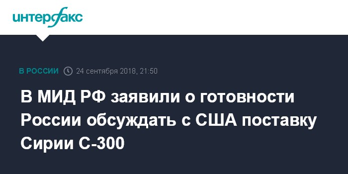 Москва. 24 сентября. INTERFAX.RU - Российская сторона готова обсуждать с США все вопросы, касающиеся Сирии, в том числе поставку Дамаску комплексов С-300, заявил замглавы МИД РФ Сергей Рябков.