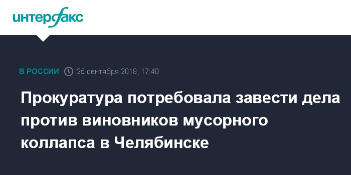 Москва. 25 сентября. INTERFAX.RU - Прокуратура Челябинской области направила в следственные органы требование возбудить уголовные дела в отношении руководителей ООО "Горэкоцентр+" и МУП "ГорЭкоЦентр", допустивших мусорный коллапс в Челябинске.