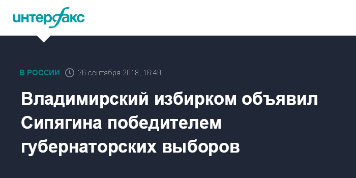 "Был подписан протокол о результатах повторного голосования. Голосование признано состоявшимся. Комиссия постановила считать избранным на должность губернатора Владимирской области Владимира Сипягина", - уточнил собеседник агентства.