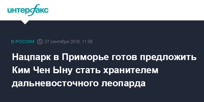 Москва. 27 сентября. INTERFAX.RU - Руководство приморского нацпарка "Земля леопарда" выражает заинтересованность в сотрудничестве с учеными из КНДР и готово предложить северокорейскому лидеру Ким Чен Ыну стать хранителем леопарда.