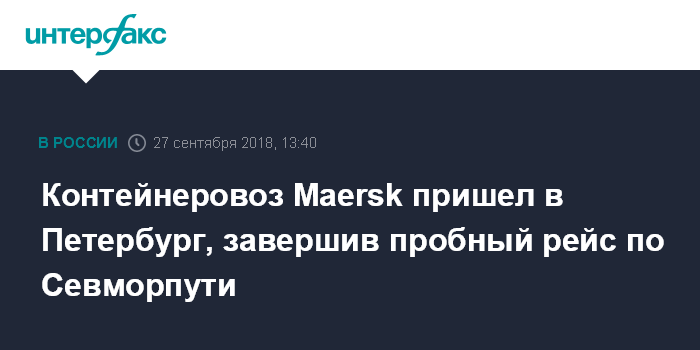 Москва. 27 сентября. INTERFAX.RU - Контейнеровоз датской A.P.Moeller-Maersk A/S пришел в порт Санкт-Петербург, завершив первый пробный рейс по Северному морскому пути.