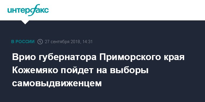 Москва. 27 сентября. INTERFAX.RU - Временно исполняющий обязанности губернатора Приморского края Олег Кожемяко пойдет на выборы главы этого региона как самовыдвиженец. Об этом он заявил в четверг в новостях канала "Россия-24".