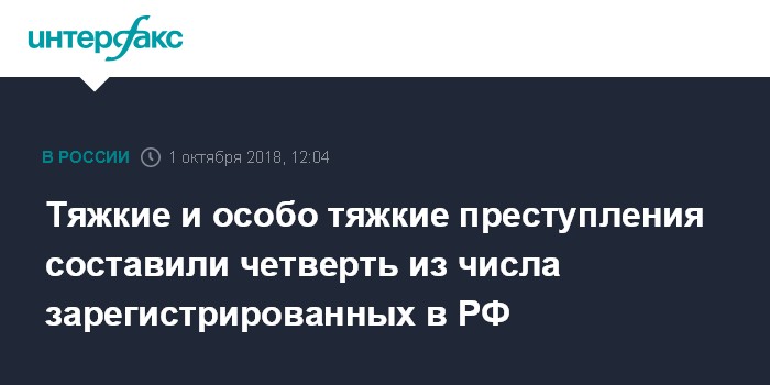 Москва. 1 октября. INTERFAX.RU - С начала этого года количество тяжких и особо тяжких преступлений составило более 22% от числа всех зарегистрированных по стране, при этом количество тяжких сокращается, сообщается в эфире официального видеоканала Генпрокуратуры России.