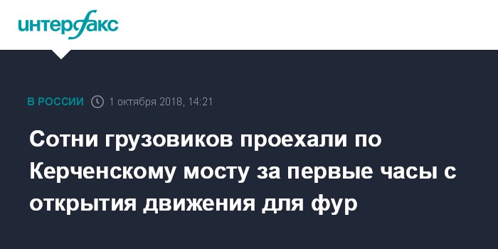 Москва. 1 октября. INTERFAX.RU - Более 700 грузовиков проехали по Крымскому мосту за первые восемь часов после запуска движения для фур, сообщил инфоцентр "Крымский мост" в понедельник.