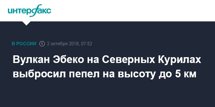 Москва. 2 октября. INTERFAX.RU - Расположенный на острове Парамушир (Северные Курилы, Сахалинская область) вулкан Эбеко во вторник утром выбросил столб пепла высотой до 5 км над уровнем моря, сообщает пресс-служба ГУ МЧС по Сахалинской области.