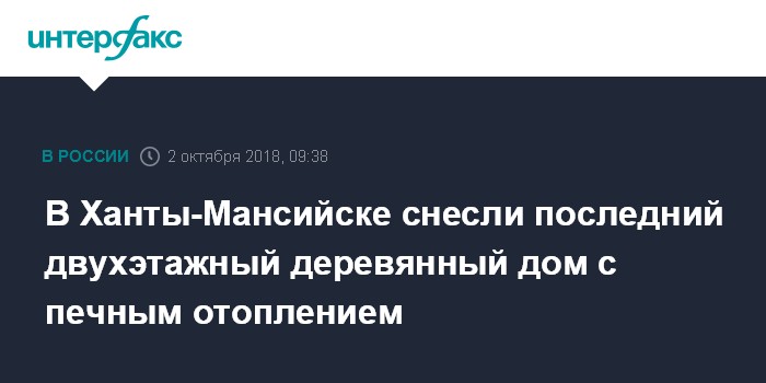 Москва. 2 октября. INTERFAX.RU - Последний двухэтажный деревянный жилой дом с печным отоплением снесен в Ханты-Мансийске, сообщается на сайте городской администрации.