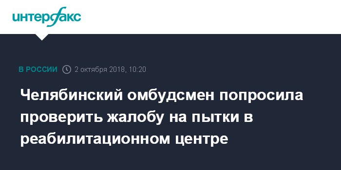 Москва. 2 октября. INTERFAX.RU - Уполномоченный по правам человека в Челябинской области Маргарита Павлова обратилась в правоохранительные органы с просьбой проверить информацию о возможных пытках пациентов коммерческого реабилитационного центра в Чебаркуле.