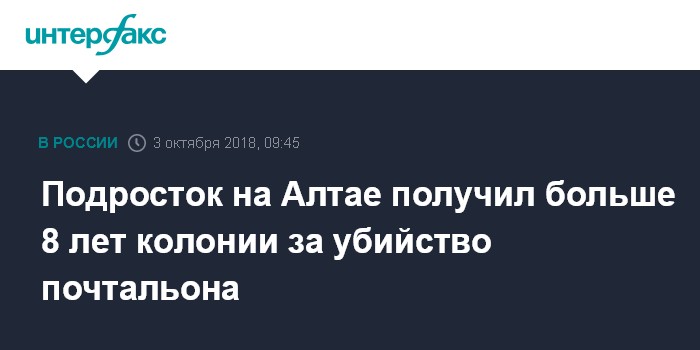 Москва. 3 октября. INTERFAX.RU - 16-летний подросток в Алтайском крае приговорен к 8 годам и 7 месяца колонии за убийство и ограбление почтальона, сообщает в среду управление СКР по региону.