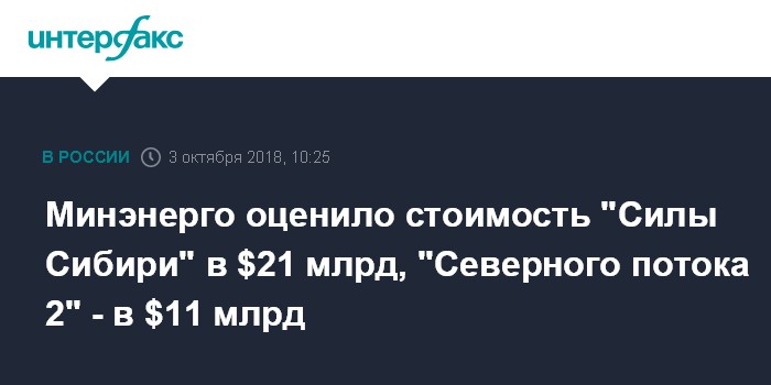 Москва. 3 октября. INTERFAX.RU - Капвложения в строительство газопровода "Сила Сибири" составят $21 млрд, в газопровод "Северный поток 2" - $11 млрд, говорится в слайдах Минэнерго, представленных министром энергетики РФ Александром Новаком в ходе Российской энергетической недели.