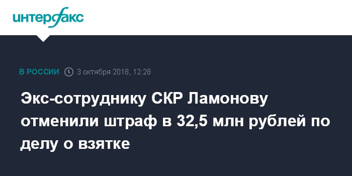 "Приговор Московского городского суда от 26 июля 2018 года в отношении Ламонова изменить: исключить из него дополнительное наказание в виде штрафа, в остальной части - оставить приговор без изменений", - говорится в решении коллегии Верховного суда. Ранее суд первой инстанции назначил ему штраф в размере однократной суммы полученной им взятки - 32,5 млн рублей.