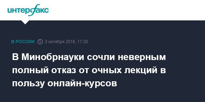 Москва. 3 октября. INTERFAX.RU - Министр науки и высшего образования России Михаил Котюков заявил, что в его ведомстве не планируют полностью отказаться от лекционной модели преподавания в вузах, заменив очные лекции онлайн-курсами.