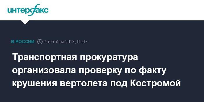 "Северо-Западной транспортной прокуратурой организована проверка соблюдения законодательства о безопасности полетов в связи с падением вертолета 3 октября в Солигаличском районе Костромской области. В результате этого происшествия есть погибшие", - говорится в сообщении.