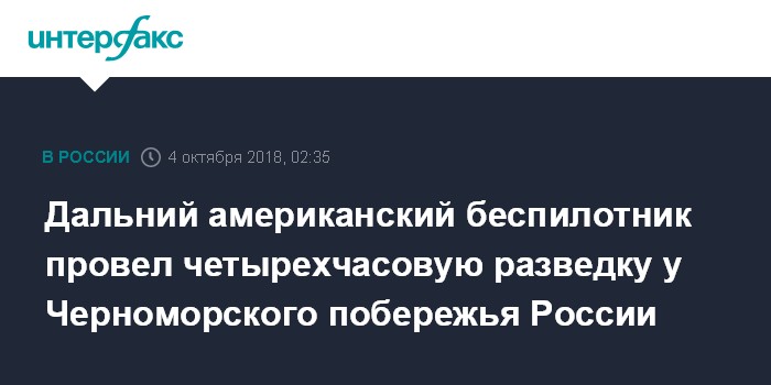 Москва. 4 октября. INTERFAX.RU - Стратегический беспилотный летательный аппарат ВВС США RQ-4A Global Hawk в среду после выполнения семичасового задания вблизи линии разграничения в Донбассе провел длительную разведку у побережья Крыма и Краснодарского края, следует из мониторинговых данных западных авиационных ресурсов.