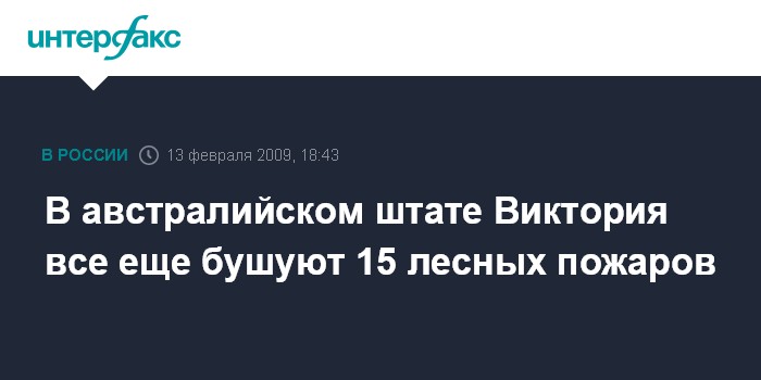 Сидней. 13 февраля. INTERFAX.RU - В австралийском штате Виктория осталось 15 непотушенных лесных пожаров, сообщает в пятницу австралийский телеканал ABC.