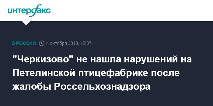 Москва. 4 октября. INTERFAX.RU - Группа "Черкизово" не нашла нарушений на принадлежащей ей Петелинской птицефабрике.