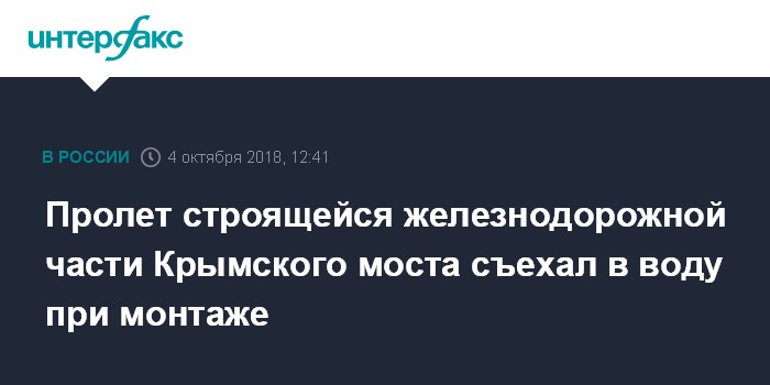 Москва. 4 октября. INTERFAX.RU - Один из железнодорожных пролетов строящейся железнодорожной части моста через Керченский пролив накренился и упал в акваторию на мелководье, пострадавших нет, сообщил в четверг информационный центр "Крымский мост".