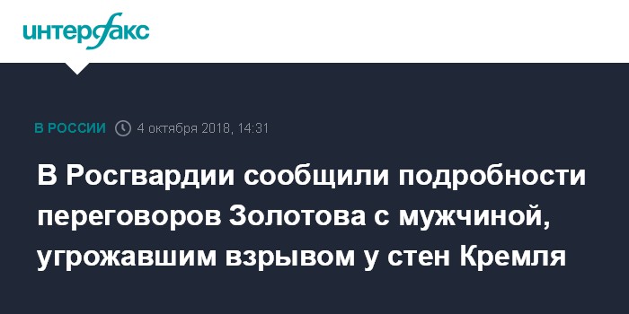 Москва. 4 октября. INTERFAX.RU - В Росгвардии подтвердили, что директор ведомства Виктор Золотов накануне лично вел переговоры с мужчиной, угрожавшим взорвать газовый баллон на Васильевском спуске в центре Москвы.