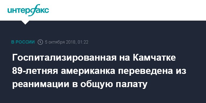 Москва. 5 октября. INTERFAX.RU - Гражданка США, госпитализированная с подозрением на инфаркт в Камчатскую краевую больницу имени Лукашевского, переведена из реанимации в общую палату, сообщает краевое министерство здравоохранения.