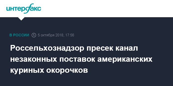 Поставки мяса птицы из США в Россию запрещены с 2014 года. Между тем, Россельхознадзор установил факты реализации в Омской, Новосибирской и Оренбургской областях американских куриных окорочков, ввезенных в Россию из Казахстана, сообщила служба. Так, в конце сентября на железнодорожной станции в Смоленской области территориальное управление Россельхознадзора совместно с управлением ФСБ по Смоленской области досмотрели 39 железнодорожных контейнеров с мясом птицы (куриными окорочками), следовавших из Литвы в Казахстан.