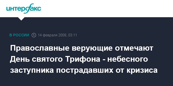 Москва. 14 февраля. ИНТЕРФАКС - Русская православная церковь вспоминает в эту субботу святого мученика Трифона, к которому традиционно обращаются при финансовых неудачах и проблемах в служебных делах, что особенно актуально в период экономического кризиса.