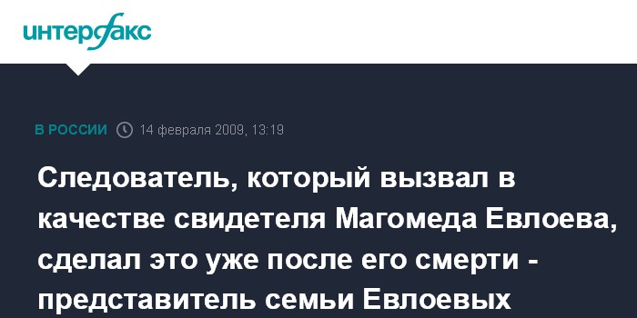 Москва. 14 февраля. INTERFAX.RU - Следователь, который обеспечивал привод в качестве свидетеля владельца сайта Ингушетия.ру Магомеда Евлоева, погибшего после задержания милицией в аэропорту Магаса, заявил, что санкционировал его вызов уже после его гибели, утверждает представитель семьи Евлоева.