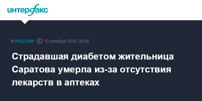 Москва. 10 октября. INTERFAX.RU - В Саратове из-за отсутствия необходимых лекарств скончалась 28-летняя женщина, больная сахарным диабетом, сообщается на сайте прокуратуры Саратовской области.