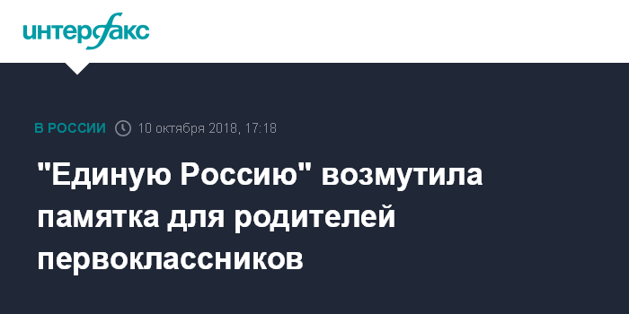 Москва. 10 октября. INTERFAX.RU - "Единая Россия" попросила министерство просвещения разобраться со школьной памяткой "5 правил родителям первоклассника", которую раздавали в школах и детсадах Петербурга, Нижегородской и Ивановской областях.