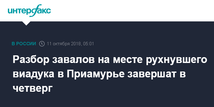Москва. 11 октября. INTERFAX.RU - Все крупные фрагменты рухнувшего на станции Свободный (Амурская область) виадука вывезены, полностью завершить разбор завалов аварийные бригады планируют к полудню четверга.