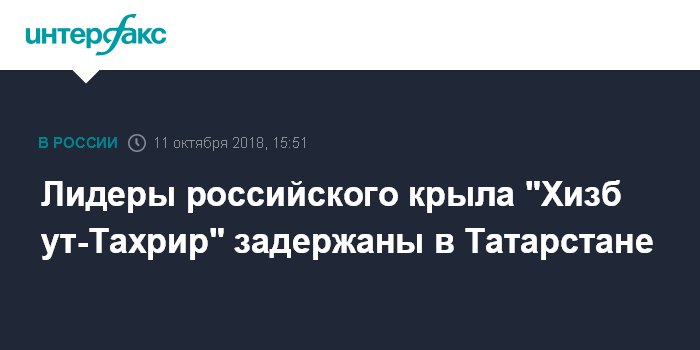 Москва. 11 октября. INTERFAX.RU - Лидеры российского крыла международной террористической организации "Хизб ут-Тахрир аль-Ислами" (запрещена в РФ) задержаны в Татарстане, сообщили в четверг "Интерфаксу" в Центре общественных связей (ЦОС) ФСБ РФ.