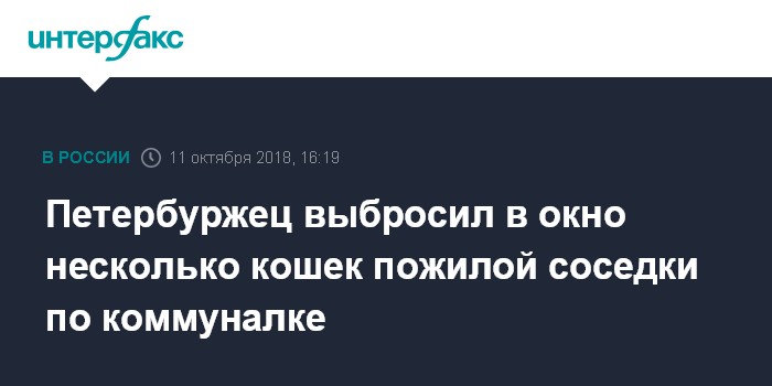 Москва. 11 октября. INTERFAX.RU - Полиция Санкт-Петербурга проводит проверку в связи с информацией о бытовом конфликте в коммуналке, в ходе которого из окна квартиры выбросили нескольких кошек.
