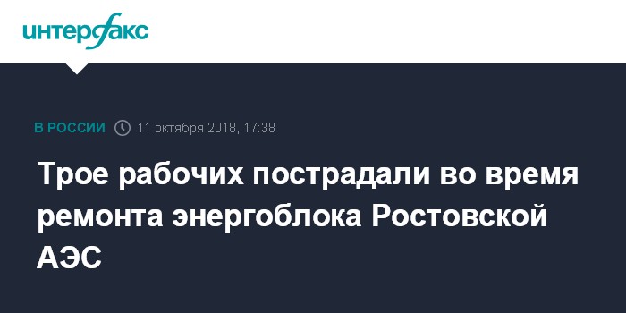 "Сегодня, 11 октября около 14 часов при выполнении работ по проверке плотности газовой системы генератора энергоблока №1 Ростовской АЭС, который находится в планово-предупредительном ремонте, пострадали три работника волгодонского филиала АО "Атомэнергоремонт", - говорится в сообщении.