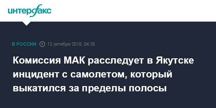 Москва. 12 октября. INTERFAX.RU - Комиссия Межгосударственного авиационного комитета (МАК) прибыла в четверг вечером в Якутск для расследования авиапроисшествия, когда самолет выкатился за пределы взлетно-посадочной полосы, сообщили агентству "Интерфакс" в пресс-службе аэропорта "Якутск".